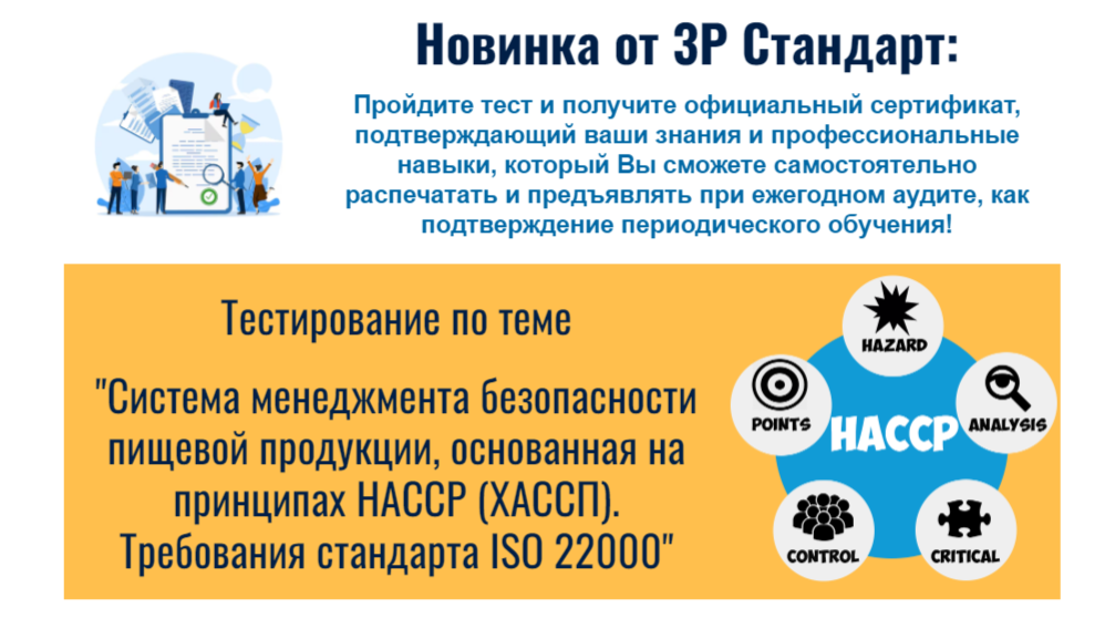 Наш партнерский учебный центр Р Стандарт (имеет лицензию на осуществление образовательной деятельности) приглашает сотрудников пищевого предприятия пройти тестирование по системе менеджмента безопасности пищевой продукции и проверить свои знания:
